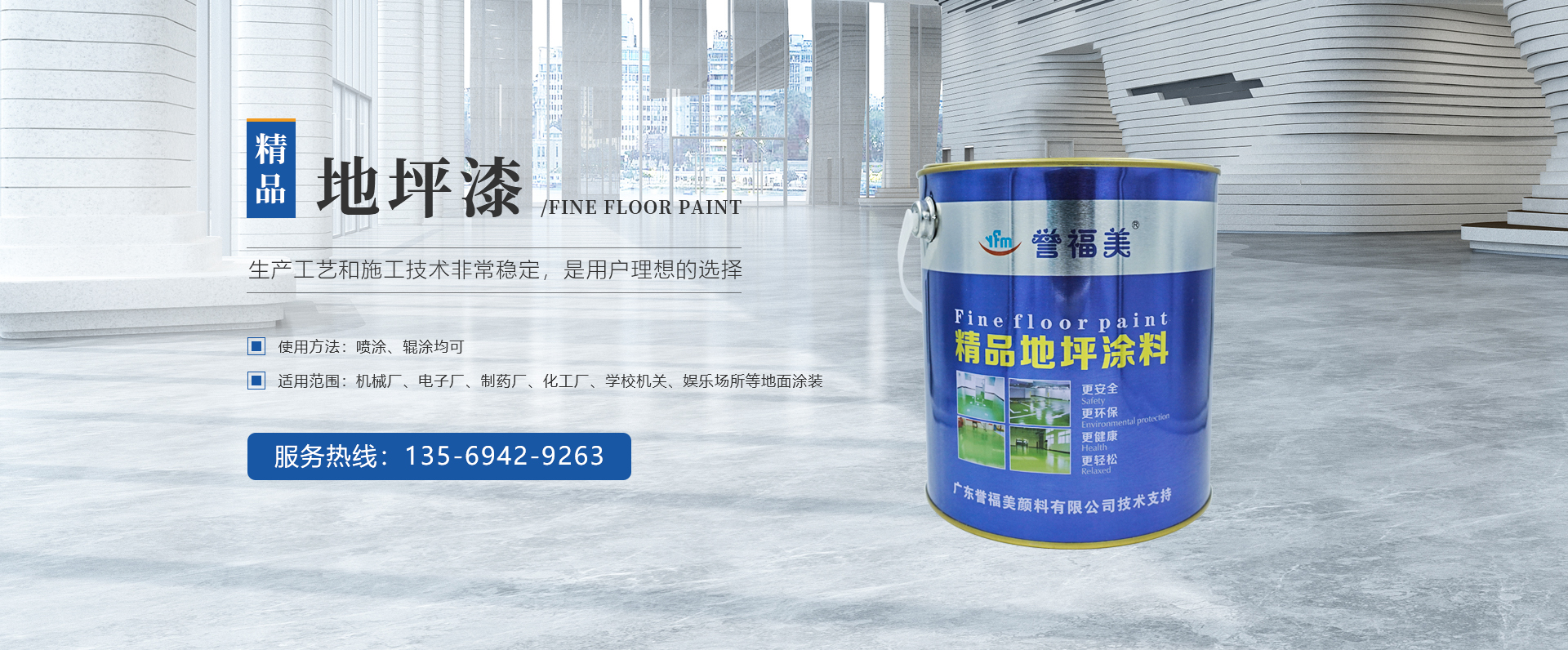 廣泛應(yīng)用于機(jī)械廠、電子廠、制藥行業(yè)、化工廠、各類工業(yè)廠房、學(xué)校機(jī)關(guān)、娛樂場所等地面涂裝。廣泛應(yīng)用于機(jī)械廠、電子廠、制藥行業(yè)、化工廠、各類工業(yè)廠房、學(xué)校機(jī)關(guān)、娛樂場所等地面涂裝。
